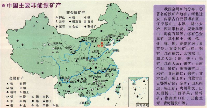 中国幅员广大,地质条件多样,矿产资源丰富,已探明储量的有157种。其中钨、锑、稀土、钼、钒和钛等的探明储量居世界首位。煤、铁、铅锌、铜、银、汞、锡、镍、磷灰石、石棉等的储量均居世界前列。中国矿产资源分布的主要特点是,地区分布不均匀。如铁主要分布于辽宁、冀东和川西,西北很少;煤主要分布在华北、西北、东北和西南区,其中山西、内蒙古、新疆等省区最集中,而东南沿海各省则很少。
