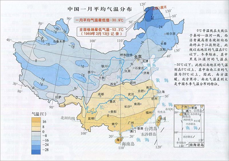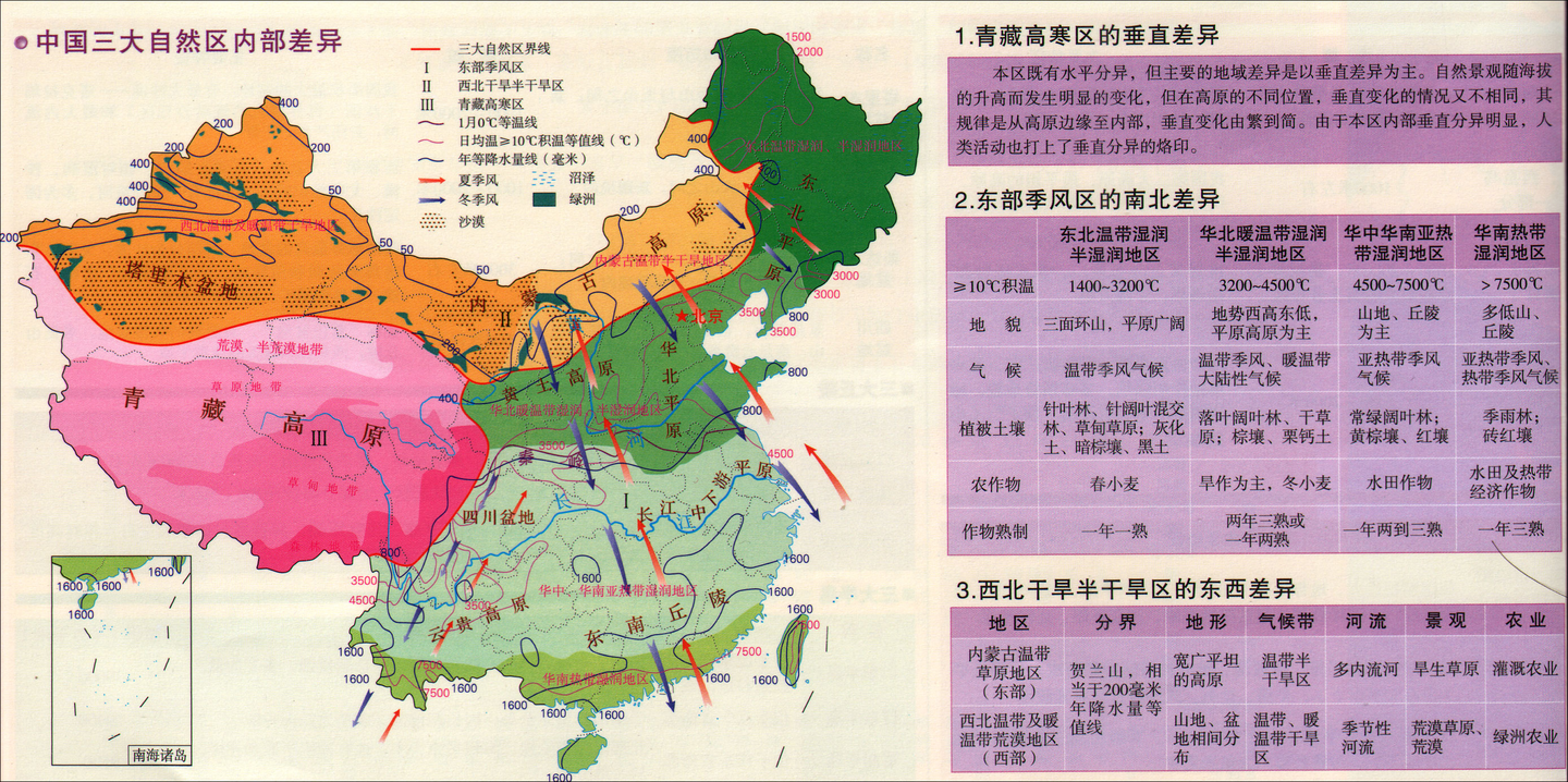 中国幅员辽阔,跨纬度较广,距海远近差距较大,加之地势高低不同,地貌类型及山脉走向多样,因而气温、降水的组合差别很大,形成了各地多种多样的气候。从气候类型上看,东部属季风气候,西北部属温带大陆性干旱气候,青藏高原属高寒气候。