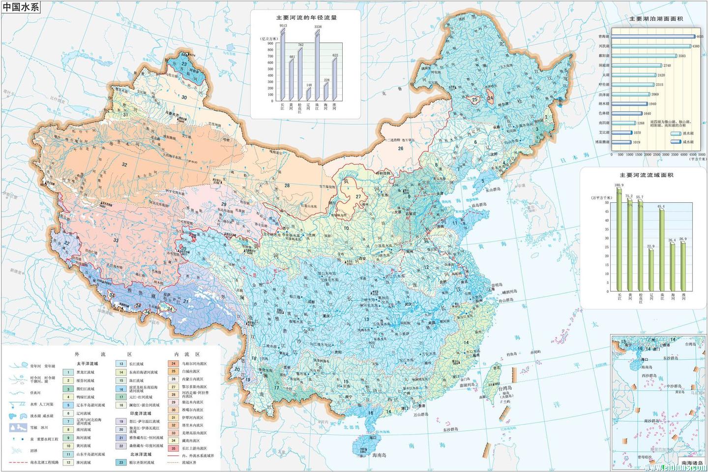 中国是世界上河流最多的国家之一,有许多源远流长的大江大河,河湖地区分布不均,内外流区域兼备。中国外流区与内流区界线大致是:北段大体沿着大兴安岭—阴山—贺兰山—祁连山(东部)一线,南段沿着巴颜喀拉山—冈底斯山一线,这条线东南部是外流区,约占全国总面积2/3,河流水量占全国河流总水量95%以上。