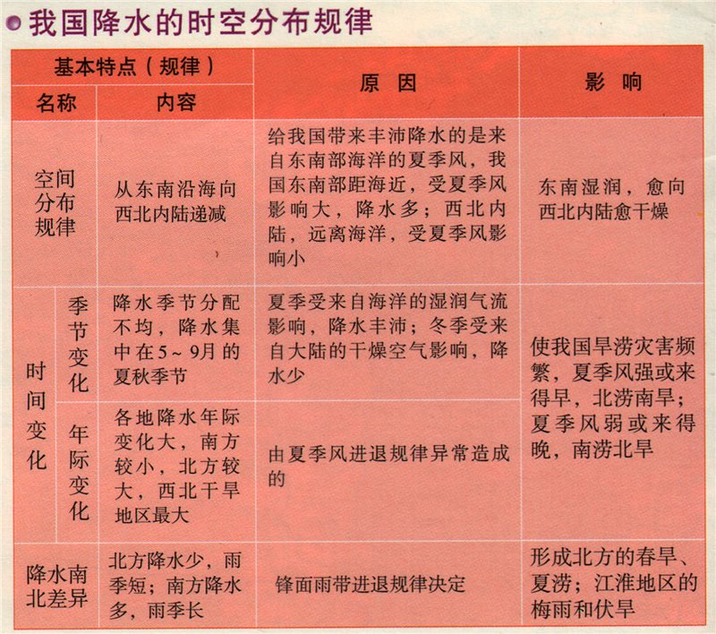季节性。春季往往南涝北旱,盛夏往往南旱北涝。