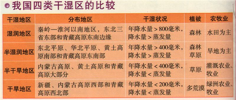 800mm年等降水量线:以秦岭-淮河为界,以南为湿润区,以北为半湿润区;