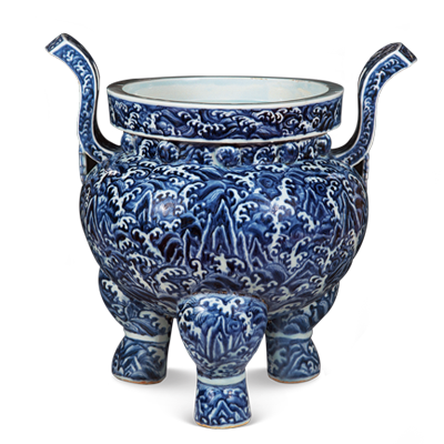 青花寿山福海纹炉上虽然没有书官窑款,但它不仅是明代宣德朝官窑瓷,而且是官窑瓷中的重要器物。炉高58厘米,造型仿青铜鼎。它与一般白地蓝花的青花器不同,是蓝地白花,即以青花为地,白釉表现海浪。浓重的青花发色、青料略有蕴散的缺陷美、仿青铜鼎的造型与满器似要外溢的海浪相融于一体,使青花炉具有憾人心魄的艺术魅力,令观者为之动容。完整的宣德青花寿山福海纹炉仅存一、二件,足以见其珍贵。