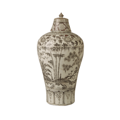 为国宝级文物,是现存惟一一件带盖子而且保存完整的洪武釉里红梅瓶。此梅瓶造型优美,器型完整无缺,岁寒三友指松树、绿竹、梅花三种常绿植物,象征着高洁的志向。系永乐帝女安成公主之陪葬品。瓶浅足沙底,盖成铎形,釉质细腻,釉里红发色欠佳,窑变黑色,瓶身装饰有七组图案组成,颈上蕉叶纹,肩部纹饰三道(如意云、卷草、缠枝菊花)正中以岁寒三友图为主题,夹饰芭蕉、山石,花卉。其下绘波涛海水纹,胫部仰莲一周。