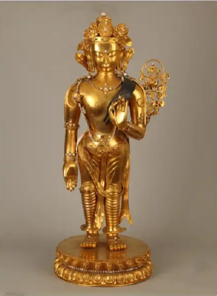这尊佛像由纯度很高的黄金制成,通高88厘米,且佛身与莲座皆装饰华丽,嵌珍珠宝石,雍容华贵,尽显皇家气派,应是清王朝全盛时期由宫廷的能工巧匠制作而成,代表了清代宫廷造像工艺最高水平。