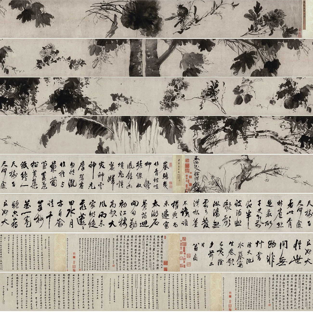 画卷长十余米,徐渭以酣畅淋漓之笔法,疾飞狂扫之气势,用焦墨、泼墨、积墨等多种笔法和技法,把牡丹、石榴、荷花、梧桐、菊花、南瓜、扁豆、紫薇、紫藤、芭蕉、梅花、兰花、竹子等13种花卉蔬果表现的淋漓尽致。