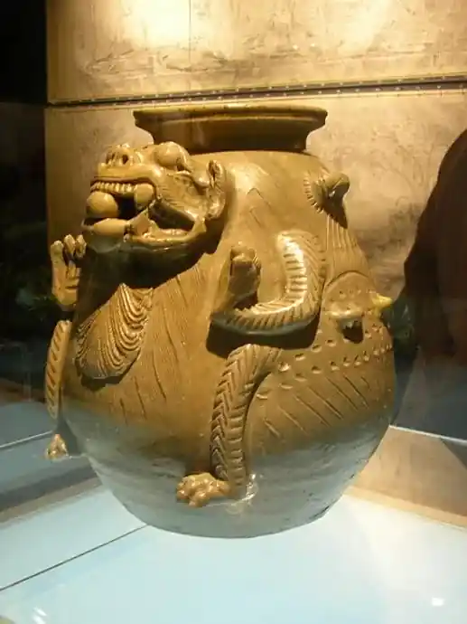 西晋青瓷神兽尊是南京博物院十件国宝级文物之一,在1976年出土于宜兴周处家族墓周墓墩中。神兽尊造型略微呈梨式,肩部两侧和腹部各有三只横系,上大下小,作品字形排列,平底微内凹。此青瓷神兽尊体量大,神兽的神态惊人,全身刻满纹饰,造型独特而又具有西晋瓷器的典型特征,是我国最早有铭款的瓷器之一。