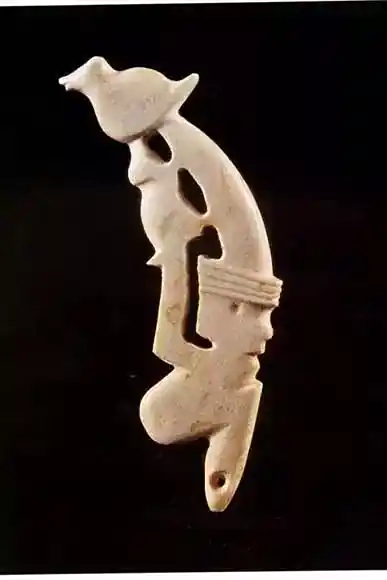 透雕人鸟兽玉饰件出土于1991年,昆山市赵陵山遗址77号墓中。赵陵山位于昆山市张浦镇西南,属长江三角洲太湖水乡地带新石器时代遗址。