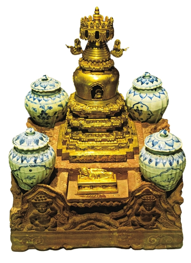 上世纪50年代,在牛首山弘觉寺塔地宫出土了一件鎏金藏式佛塔。这是明代佛教工艺绝品,国内出土唯一一件“迷你型”鎏金喇嘛塔。这个鎏金喇嘛塔非常精美,在喇嘛塔的四周还有兽角佛像、瓷罐、玉瓶等。塔身有四个壶门,内有释迦、韦陀佛像,上施有相轮、十三天、宝盖、宝珠等。塔内须弥座上布置有一组佛像,须弥座内藏有珍珠、宝石、水晶、玛瑙、玉石、骨灰等物。整个鎏金塔安放在一个红色砂岩雕成的须弥山形基座上,四面雕刻胡人献宝、双狮戏球、双鹿嬉戏、蛟龙穿浪图案。塔座下枋刻:“金陵牛首山弘觉禅寺永充供养”,背面是“佛弟子御用监太监李福善奉施” 。